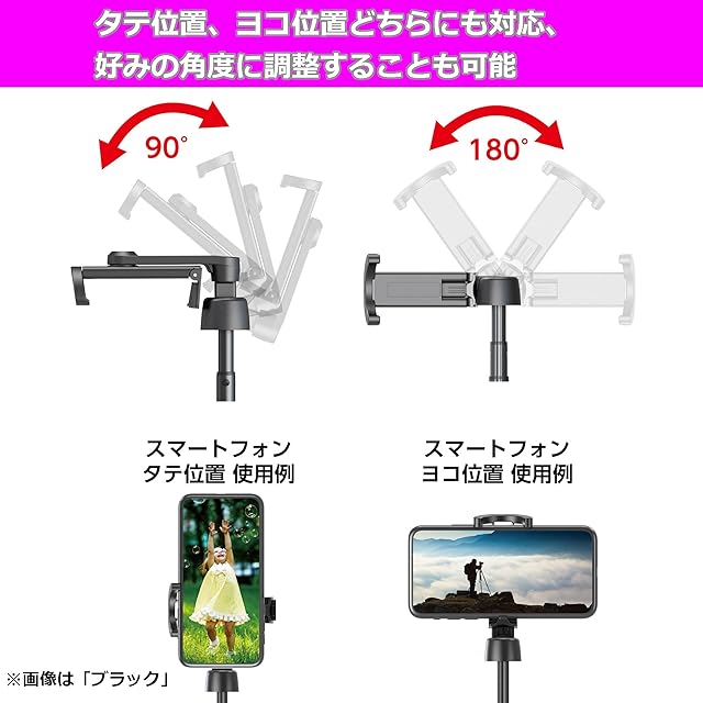 ホルダー部分はタテ・ヨコどちらにも対応。左右前後に動き、好みの角度に調整することが可能です。・対応スマートフォンサイズ:幅約56~80mm、厚み約10mm以内