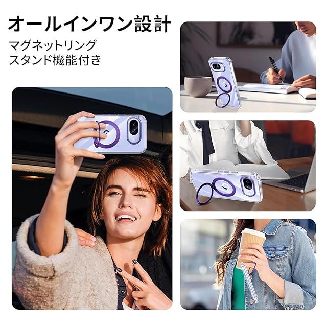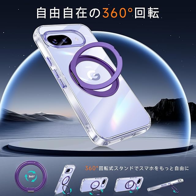 商品名:【米軍MIL規格・Magsafe対応】Google Pixel 9a 用 ケース MagSafe対応 リング 360°回転スタンド機能 縦横両対応 透明 黄ばみ防止 ワイヤレス充電 レンズ保護 耐衝撃 携帯カバー グーグルピクセル9a カバー 6.3 インチ マグネット搭載 車載ホルダー マグセーフ対応 おしゃれ (クリアパープル)