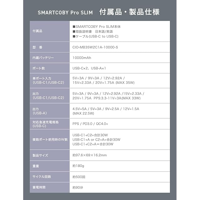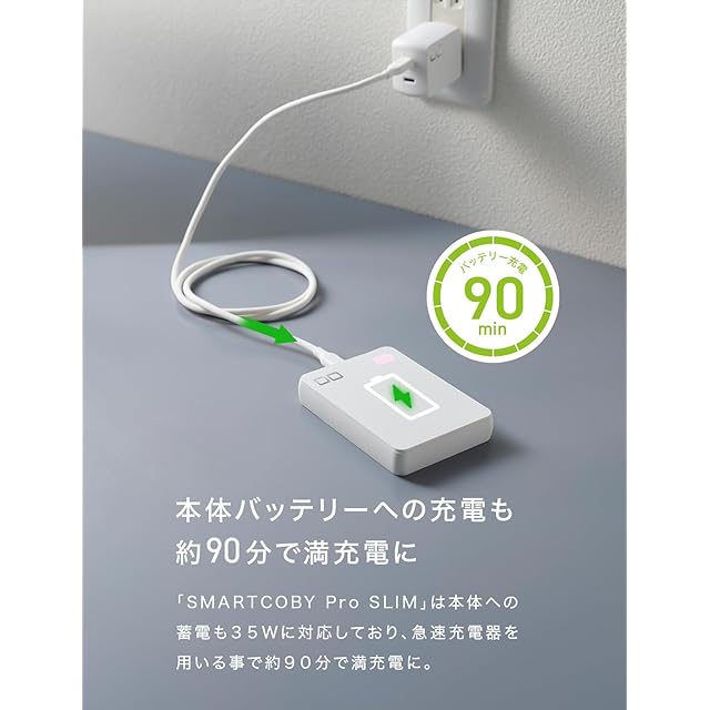 【3ポート搭載】平らなフォルムを最大限活かすため、USB-Cポート×2、USB-Aポート×1の合計3つの充電口を搭載。 様々な用途の充電が可能となり、充電しながらiPhoneやAndroid等のCポートが必要なデバイスを充電したり、 イヤホン等のAポートが必要なデバイスを充電したりと、お持ちのデバイスやケーブル状況にあわせたパススルー充電が可能となります。【急速充電】 更に『SMARTCOBY Pro SLIM』はPPSにも対応している為、 Galaxyは超急速充電モードで充電可能です。 本体は35Wに対応しており、急速充電器を用いる事で約90分で満充電に。
