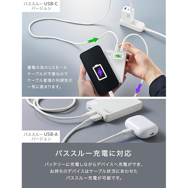 【パススルー充電対応】デバイスとバッテリーの両方を充電 バッテリーを経由しながらデバイスの急速充電が可能。バッテリーを充電するのが面倒で、使いたい時にバッテリーが空になっているとき、『SMARTCOBY Pro SLIM』はパススルー機能搭載で、バッテリーに充電しながらスマホなどへの充電にも対応しております。 コンセントが一つしかない環境や、両方を充電したいときに大活躍します。 ※最大35Wの蓄電を行うには、USB PD規格に対応した35W以上の出力が可能な充電器をご使用ください。 CIO製USB充電器をご使用いただくことで、互換性や安全性を確保できます。 他社製充電器をご使用の場合は、USB PD規格対応かつ35W以上の出力が可能な製品をご選択ください。