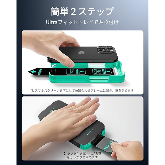 【一瞬で完璧フィット】iPhone 16pro専用 スクリーン保護フィルム用のフィットトレイ(使用前によくお読みください)、クリーニングキット、素早く気泡無し貼り付け用のホコリ付着防止接着剤が梱包されています。フィルムが自動で吸着し、ズレや気泡、ホコリ、端浮きなどの問題が一切ありません。対応機種:いphone16pro 保護フィルム