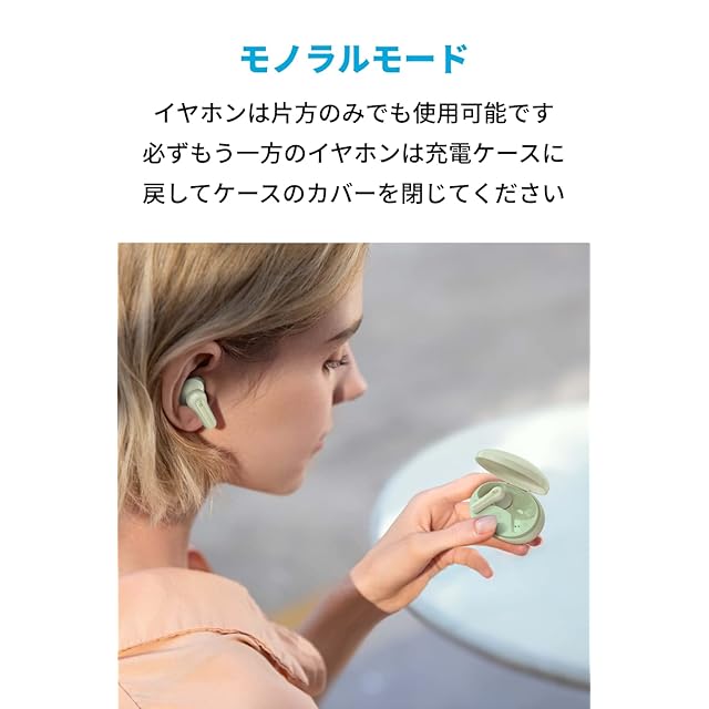 Soundcore | Hear It. Feel It.<br> 心地良く、等身大に音楽を楽しみたいあなたへ贈る、Ankerのオーディオブランド<br><br>製品の仕様<br> 再生可能時間:最大8時間(イヤホン本体のみ) / 最大32時間(充電ケース使用時)<br> 充電端子:USB Type-C<br> 重さ:約47g(充電ケース含む) / 約4.4g(イヤホン本体 片耳)<br> 防水規格:IPX5<br> 通信方式:Bluetooth 5.2<br> Bluetoothプロファイル:A2DP, AVRCP, HFP, HSP<br> 対応コーデック:SBC / AAC<br><br>注意<br><br>・本製品はSoundcoreアプリ非対応です。<br>・お使いの機器とイヤホンを接続する前に、必ずイヤホンのシールを剥がしてからケースに戻して電源を入れてください。<br>・片耳使用時はイコライザー設定は切り替えできません。<br><br>パワフルなサウンド<br>3層構造の大型の10mmドライバーを搭載。コンパクトな小型モデルながら、迫力ある低音を実現します。<br><br>好みのチューニングが選べる<br>バランスの取れた通常モードに加え、低音を増幅させた低音モード、音声をクリアに強調するボーカルモードの3つのイコライザーモードからお好みに合わせてお選びいただけます。<br>※イコライザー設定は、イヤホン本体(右耳)を3回タップして切り替え可能です。<br><br>軽くコンパクトなサイズ感<br>イヤホンの重さは約4.4g。どんなに長時間装着していても疲れることはありません。ケースもコンパクトなサイズで小さなポケットやカバンの中にもすっきりと収まります。<br><br>最大32時間の長時間再生<br>イヤホン本体が満充電の状態で、最大8時間の音楽再生が可能です。また付属の充電ケースを合わせて使えば、最大32時間の連続再生が可能です。また10分間の充電で約1時間の音楽再生が可能です。<br>※再生可能時間は、音量、再生する内容、使用環境によって異なります。<br><br>クリアな音声通話<br>AIノイズリダクション搭載。AIがあなたの音声と周辺のノイズを認識し、ノイズを除去しながら人の声を大きく伝送することで、通話相手はあなたの音声をよりクリアに聞くことが可能です。<br>※この機能は通話時のノイズを除去する機能であり、音楽を聴くときに周囲の雑音を除去するものではありません。<br><br>片耳でもお楽しみいただけます<br>左右のイヤホンの単独使用と両耳での使用を簡単に切り替えることができます。<br>※片耳使用時は、もう片方のイヤホンを充電ケースに戻し、ケースの蓋を閉じてください。<br>※片耳使用時は、イコライザー設定は切り替えできません。<br><br>1ステップで簡単接続<br>充電ケースを開けると自動的にペアリングモードになり、簡単に接続できます。<br><br>安定した接続<br>Bluetooth 5.2に対応し、音飛びを極限まで抑え、安定した接続で音楽をお楽しみいただけます。