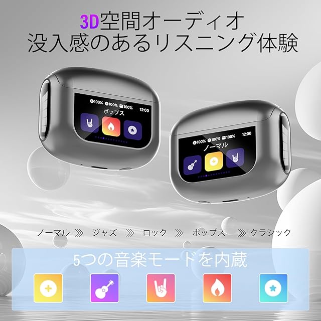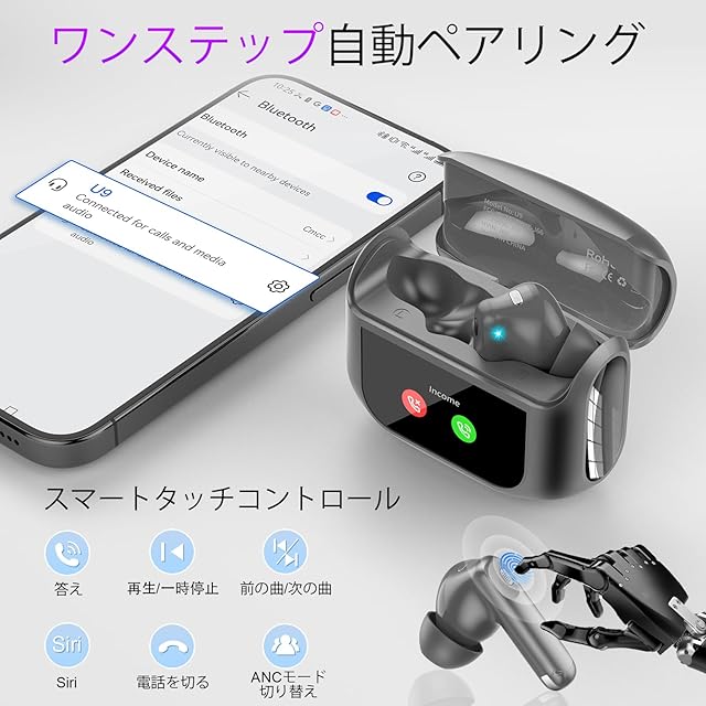 多機能スマートタッチスクリーン:このタッチスクリーンイヤホンにはカラータッチディスプレイが搭載されています。イヤホン本体または充電ケースから、音楽の再生、曲の切り替え、通話の応答と終了、ノイズキャンセリングモードの有効化など、様々な操作が可能です。さらに、タッチスクリーンには、音量調整、カメラ操作、7言語切り替え、壁紙切り替え、画面の明るさ調整、イヤホン検索、懐中電灯、タイマーなどの機能も搭載されています