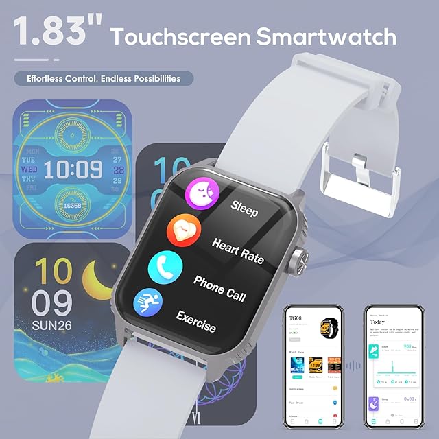 男女兼用スマートウォッチ、1.83インチHDスマートウォッチ、120種類のスポーツモード、心拍数/睡眠モニター、IP67防水、Bluetooth通話&音楽コントロール(グレー)