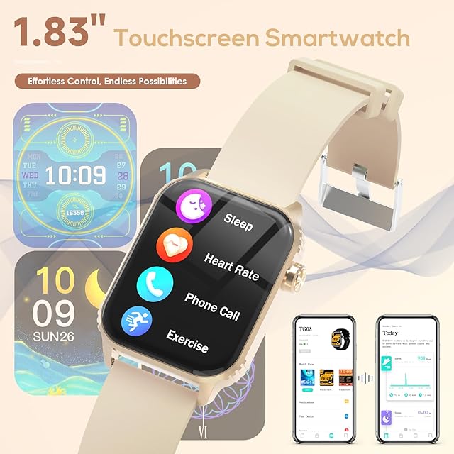 TRAUSI スマートウォッチ(男女兼用)1.83インチHDディスプレイ、120種類のスポーツモード、IP67防水、Bluetooth通話・音楽操作機能、心拍数・睡眠モニター付き(ローズゴールド)