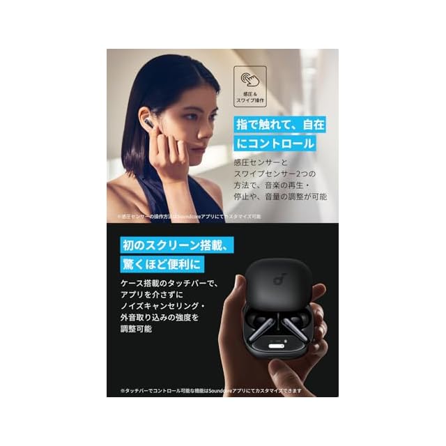 直感的な操作:イヤホン本体に感圧&スワイプセンサーを実装。またケースに搭載されたタッチバーとスクリーンで各種モード設定が可能に。アプリを介さず直感的に操作いただけます。