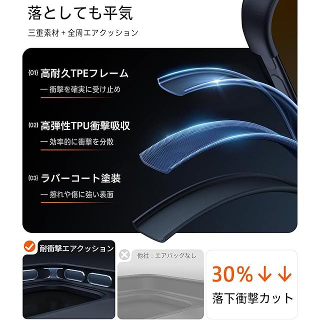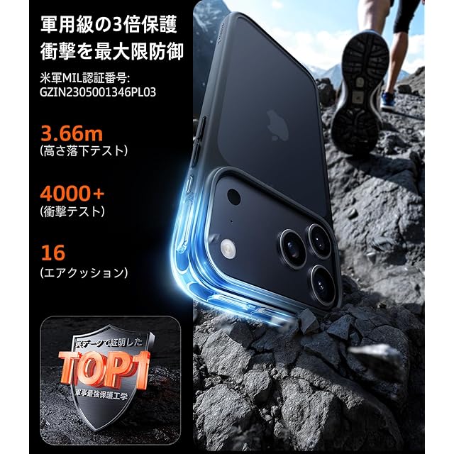 【米軍MIL規格、360°全方位保護】注意:ワイヤレス充電可能、Magsafe非対応!対応機種:For iPhone 17 Pro Max ケース (6.3インチ) 米軍MIL認証番号:GZIN2305001346PLO3 「Guardian Series」は7年間の進化で、落下防止と保護力にこだわったTORRASの最強保護シリーズである。TORRASラボで3.66mの高さから26方向で4,000回以上の落下テストをクリアし、完全無傷を実現する!ケースの四隅にはX-SHOCKエアバッグ構造を採用しており、四辺には360°ランニングトラック型のエアクッション構造を設計。全方向・死角なしでスマートフォンを保護できる。