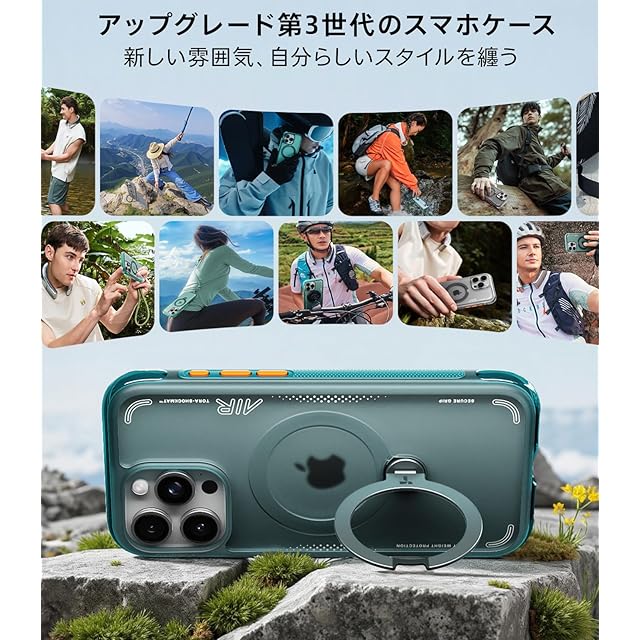 【見える最強防御!Air クッション搭載】 世界初の エアクッション 技術を搭載、100% 空気力学構造が 落下・衝突・摩擦を瞬時に分散吸収!米軍規格 4m耐落下防護性。 4m 高さから 100 回落下しても亀裂を生じにくい。-20℃~60℃の温度変化や湿度 95% 環境下でも材質劣化せず、3段階衝撃緩和メカニズム:まず初期衝撃吸収:スマホ枠の上下エアバッグが最初の衝撃波を緩衝、次にエネルギー分散:エアクッション層が衝撃力を周囲に拡散、最後に最終防護:強化フレームが残留エネルギーをブロック。満員電車でバッグから滑落、デスクワーク中のうっかり滑り、お子様の嬉しいはずみでの誤落下はもちろん、山道ハイキングでのポケットからの飛び出し、サイクリング中の激しい振動… どんなアクシデントでも、フチを1.44mm わずかに高く設計。 特にアウトドアでの使用時は、石や地面との接触による衝撃もしっかり吸収し、冒険中も安心してスマホを使えます。目で見える全方位保護で、いつも安心感をパックしています。(対応機種iPhone 16 pro Max)