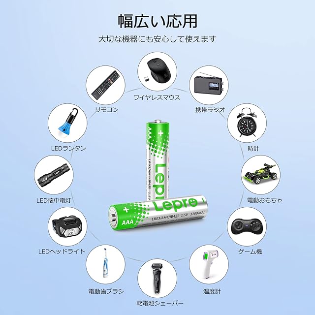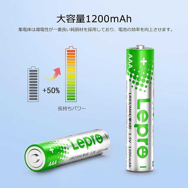 【長持ちハイパワー】高性能単4形乾電池、1200mAh大容量、長持ちパワーとコストパフォーマンスを両立させたお徳用タイプです。【液漏れ防止・安心安全設計】漏液しにくい材料、構造を採用しており、電動歯ブラシ、コードレス理美容機器、携帯ラジオ、ワイヤレスマウス、電池式おもちゃ、掛け時計、置き時計、リモコンなどの普段使いはもちろん、大切な機器にも安心して使えます。【優れた品質・長期間保存可能】高品質で長期間保存可能だから、非常用持出袋、乾電池式モバイルバッテリー、電池式ランタン、懐中電灯、ヘッドライトなどの防災用ストックにもおすすめします。【水銀0使用乾電池!環境に優しい】電池セールの構成はアルカリで環境に有害な水銀を含みませんので、環境に優しいです。※ご注意:本品は使い捨てタイプですので充電禁止です。【商品仕様】電池の形: 単4形(AAA) | 電池セールの構成: アルカリ(水銀0使用)| 電圧: 1.5V | 容量: 1200mAh | サイズ: 直径10x高さ43.9mm | 本体重量: 約11g/本 | 使用推奨期限: 5年(JISに準拠) | 再利用可能性: 使い捨て(充電禁止)