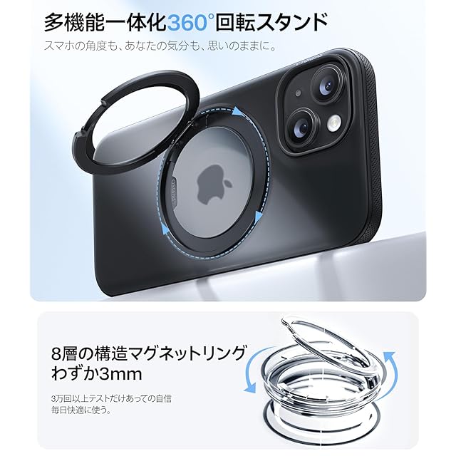 【360°回転・使用体験更なる高みへ】卓越した360°リングデザインで、従来の限界を打ち破り、iPhone 15の使い心地を高めます。2025 年更新されたこの内蔵スタンドは、カチカチとした音が回転ごとに小さな達成感をもたらし、回転がストレス解消につながります。また、好みの角度にしっかり固定できるため、動画鑑賞時の快適さが大幅に向上します。動画鑑賞する際に、夢のような映像を楽しみながら、自宅に別の世界を創り出します。さらに、360リングスタンドがあれば、片手操作がスムーズになり、好きな場所に設置して自動撮影にも活用できます。外出先でのトキメキ瞬間を捉えるのにも便利で、出会ったあらゆる美しい瞬間を簡単に記録できます。