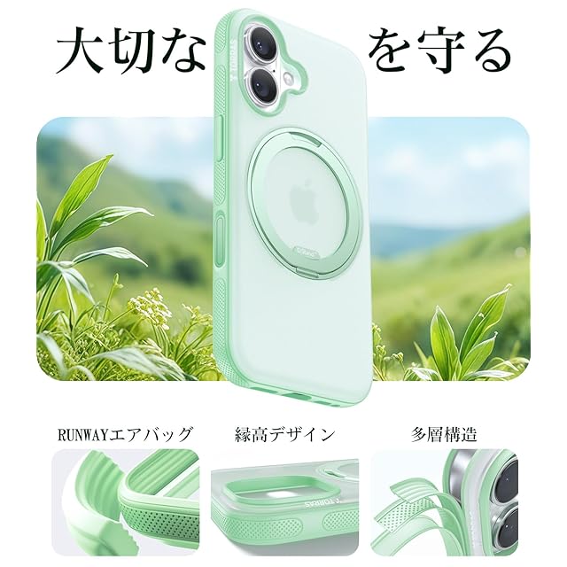 商品名:TORRAS iPhone 16 用 ケース カメラコントロールボタン付き【森色の癒し・多機能360度回転スタンド】 縦横両対応 マグネット搭載 MagSafe対応 米軍MIL規格耐衝撃 リング 指紋防止 黄変防止 マグセーフ対応 レンズ保護 滑り止めドット模様 手持ち撮影 安定性 両眼 6.1インチ「Ostand O3 Fitness」(opal green)