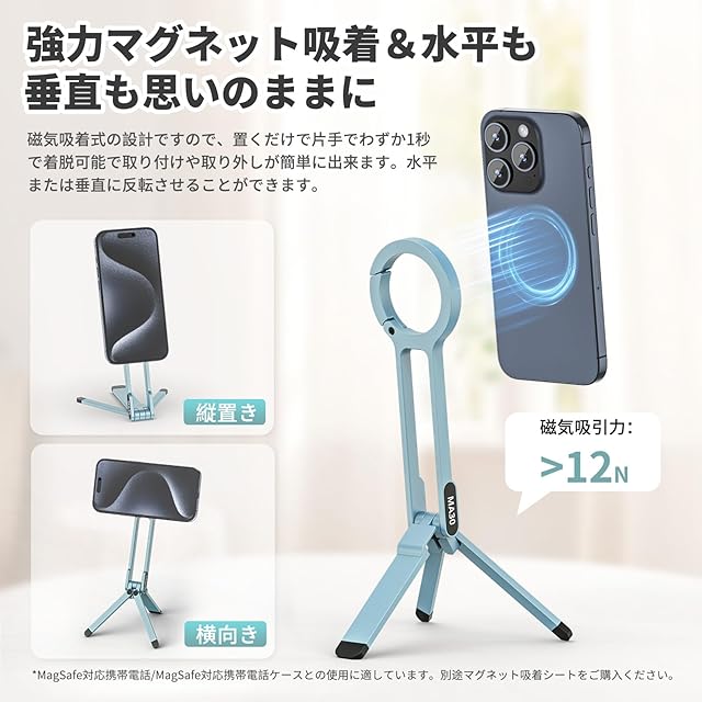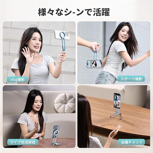 【Magsafe用 折りたたみ式 スマホ三脚 】Ulanzi MA30 Magsafe スマホ三脚ではスマホを固定する部分が強力マグネットへ進化しスマホをしっかり吸着固定します。片手でわずか0.1秒簡単に取付可能です。簡単に拡張したり折りたたんだりできるので、三脚としてだけでなく、デスクでスマホスタンドのように使ったり、セルフィーを撮影するために自撮り棒のようにも使えたり、一台で何役もこなす優れものです。軽量ながらも強度の高いアルミニウムを採用し、頑丈な三脚構造と滑り止めシリコンパッドにより、スマートフォンの落下を防ぎます。ハイキングバックルデザイン、フックハング、自由な手、負担のない旅行、いつでも、どこでも撮影を開始します。ご注意:本製品は携帯電話ホルダーとしてのみ使用され、エクストリームスポーツやプログレードの登山用バックルではありません。