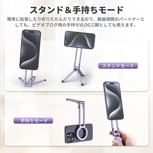 商品名:Ulanzi MA30 スマホ三脚 ミニ三脚 全金属製 magsafeに対応 折りたたみ式 持ち運び便利 スタンド&手持ちモード 361度回転 自撮り棒 スマホスタンド 携帯スタンド 安定 軽量 角度調整可能 横置き/縦置き 卓上三脚 セルフィー/生放送/撮影録画/動画鑑賞に最適 薄紫色