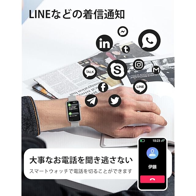 「着信通知機能付き」着信通知機能をサポートしています。電話がかかってきた場合、名前を確認することができ、必要に応じて電話を切断することができます(通話機能はありません)。また、Line、Facebook、Messager、Twitter、Whatsapp、Skype、Linkedin、Instagram、Viber、Gmailなど、多彩なメッセージアプリの通知をサポートしています。手元のスマートウォッチで通知を確認することで、いつでも大切な情報を手軽に確認できます。例えば、会議中や授業中、スマートフォンを取り出すことができなくても、手元のスマートウォッチでメッセージ通知を確認することができます。