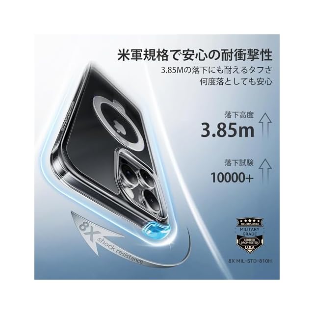 【全方位ガード!驚異の耐衝撃性】四隅のAir-Shock5.0と三層の耐衝撃構造で、落下衝撃を完全吸収。ラボで3.85mから落下試験を10,000回クリアし、厳しい米軍MIL規格認証も認証済みです。さらに、精密な縁高設計で、画面やカメラをそれぞれ1.5mm、2.5mm高く保護し、従来の保護力をはるかに超える安心感を提供します。これにより、日常のあらゆる衝撃からスマホを最大限に守ります。信頼のケースをぜひお試しください。(米軍MIL認証番号:GZMR240702237705|認証機関:CSTC Standards Testing Center | 認証時間:Jul 20, 2024)