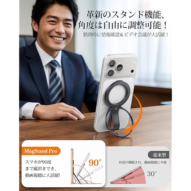 【より快適な視野角・より快適な暮らし】市販の小型スマホリングでは縦置きができなかったり、縦置きの角度が足りなかったりする問題を解決するため、Andobilのプロダクトマネージャーが5年間かけて高級牛革製MagStand Proの開発に成功しました。このMagSafe リングは、縦置きの角度が0°から90°まで、横置きの角度が0°から180°まで多角度調整することができす。MagStandは、仕事にもプライベートにも欠かせない理想的なパートナーです。仕事中は、スマホリングをしっかりと支え、快適な視角でメールや各種資料を確認したり、スムーズにビデオ会議を行ったり、業務の最新状況をすばやく把握したりすることができ、作業効率が向上します。一方で、休憩時間には、TikTokを見たり、YouTubeの動画を楽しんだり、NHKやYahooニュースをチェックしたりと、MagStandが安定した支えと自由な角度調整を提供し、リラックスしながら効率的で心地よい一日をお過ごしいただけます。