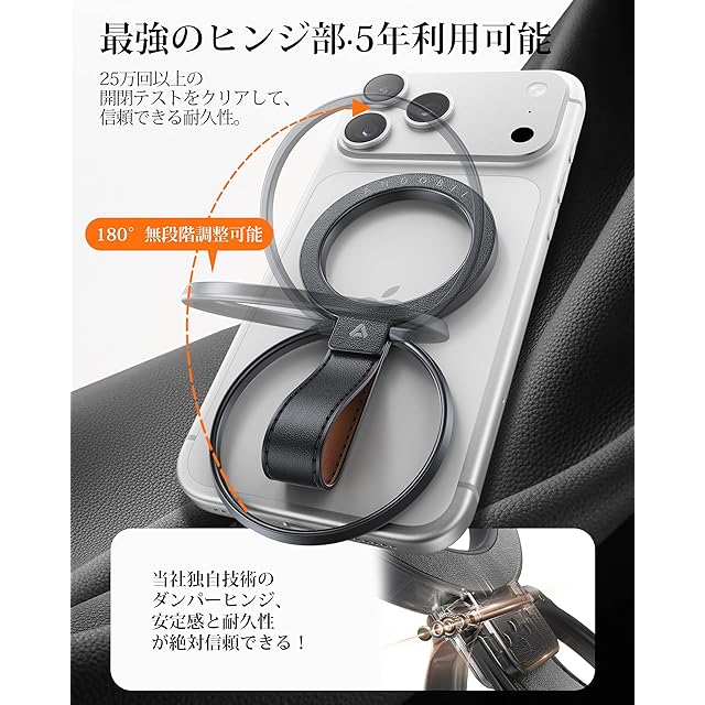 ✨【抜群な耐久性・さすがPro】従来のスマホリングでは使用するうちにヒンジ部が緩くなり、スタンドとして使えなくなったり、耐久性が低下する問題がありますが、MagStand Proは最強のヒンジを誇ります。当社のMagStand Proは、当社独自のダンパーヒンジ技術を採用し、25万回以上の360回転と上下テストをクリアしました。これにより、スタンド機能が「ガタつく」や「緩くなる」といった問題を一気に解決できました。Andobilは常に高品質で耐久性のある製品を提供することに取り組んでいます。この製品は他の市場に出回っている製品と比較して、15倍もの長い耐久性を誇っています。耐久性において安心してご利用いただけます。