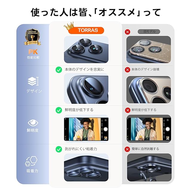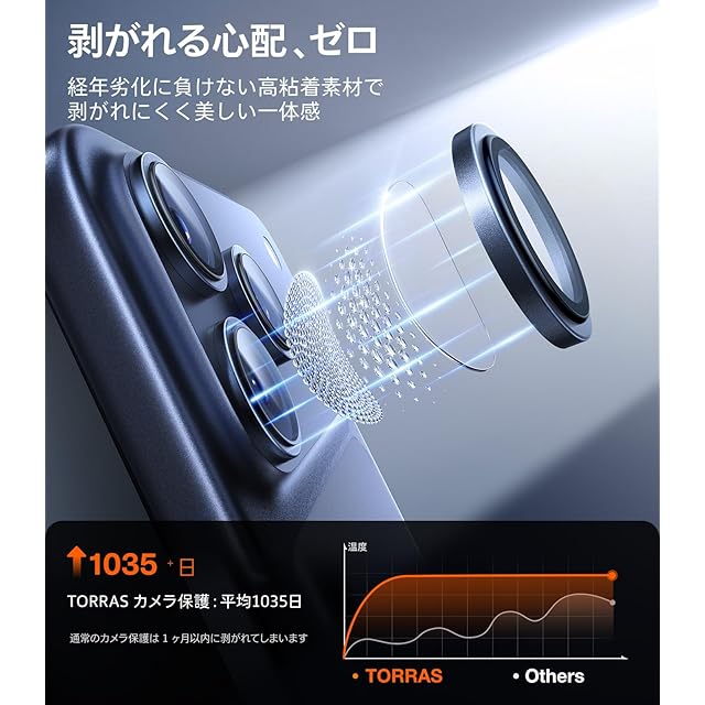 【宇宙規格の強度!大切なカメラを守る】米軍規格を超える耐衝撃性能を誇るTORRASのカメラ保護フィルムは、日常のあらゆるシーンで大切なカメラレンズを守る。電車内の落下やバッグ内の衝突からカメラを防護。航空技術を応用したイオン交換処理で硬度9H超を実現し、鍵やモバイルバッテリーとの接触でも傷を寄せ付けません。10年の技術蓄積と9600万枚の実績が、あなたの「もしも」に寄り添います。(For iPhone 17 Pro /17 Pro Max カメラ保護)