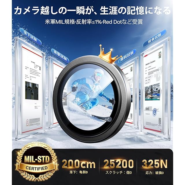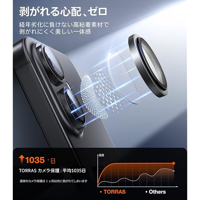 【宇宙規格の強度で、あなたの大切なカメラを守る。】TORRASのカメラ保護フィルムは、米軍規格を超える耐衝撃性能を備え、日常のあらゆる“ぶつかる・落ちる”シーンからレンズをしっかり保護。満員電車での落下。バッグの中で鍵やモバイルバッテリーとぶつかる瞬間。机からふいに滑り落ちる時。そのすべてに、レンズは無傷のまま。航空技術を応用したイオン交換強化ガラスにより、9H+を超える実用硬度を実現。鋭利な金属との接触でも、傷を寄せ付けません。10年の技術蓄積。9600万枚の販売実績(日本いち位)。“もしも”の瞬間に備え、あなたのiPhone 17のカメラを確実に守ります。(For iPhone 17 カメラ保護)