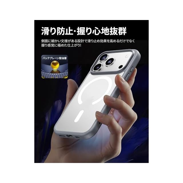 【半透明・マット仕上げ】背面は耐久性や耐摩耗性に優れたポリカーボネート使用。表面には指紋防止ナノコーティングを施しており、指紋がつく心配もありません。マットな質感でサラサラした触り心地。背面は半透明なので、リンゴマークが透けて見えるようになっています。高級感も併せ持ったケースです。また、いPhone 17 Proケースはカメラコントロールカバー付き。iPhone17シリーズからのカメラコントロールボタンに対応しています。