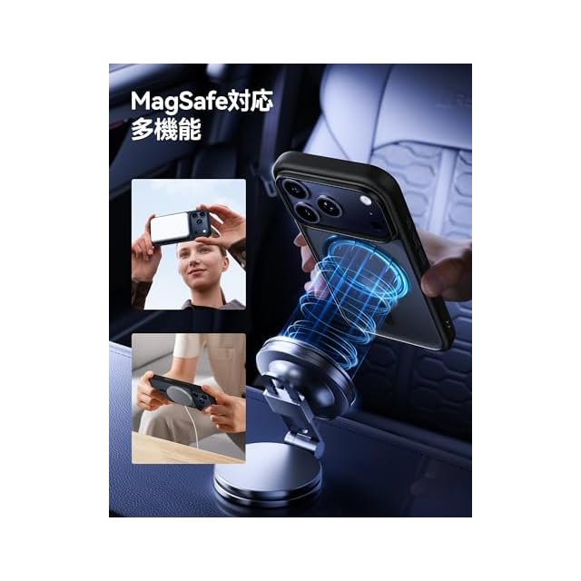 【強力な磁力吸着・高速充電】強力なマグネットが内蔵されており、差し込みのいらない超簡単充電を実現。マグネット部分は位置が正確に合致しており、ワイヤレス充電がこれまでよりもすばやく簡単に完了します。あいふぉん 17ProMaxを充電する時は、ケースを装着したままMagSafe充電器に取り付けるか、Qi規格の充電器の上に置くだけです。