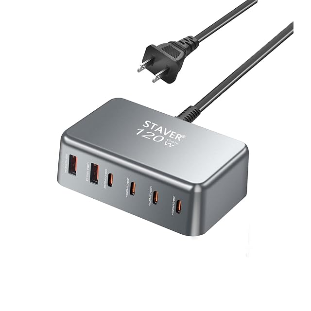 【6ポートで6台のデバイスを同時に急速充電】この充電器はUSB-Cポート×4、USB-Aポート×2の構成で、合計120Wのハイパワー出力を実現しています。6台のデバイスを同時に充電しても充電スピードが落ちることなく、真の「同時急速充電」を提供します。具体的な出力配分は、USB-C1(PD3.0 20W)+USB-C2(PD 20W)+USB-C3(PD 20W)+USB-C4(PD 45W)+USB-A1(SCP 12W)+USB-A2(SCP 12W)です。これにより、iPhone/Androidのスマートフォン、タブレット、Switch/Steam Deckなどのゲーム機、MacBook Proなどの高電力を必要とするノートパソコンなど、あらゆるデバイスを「同時急速充電」でサポートできます。