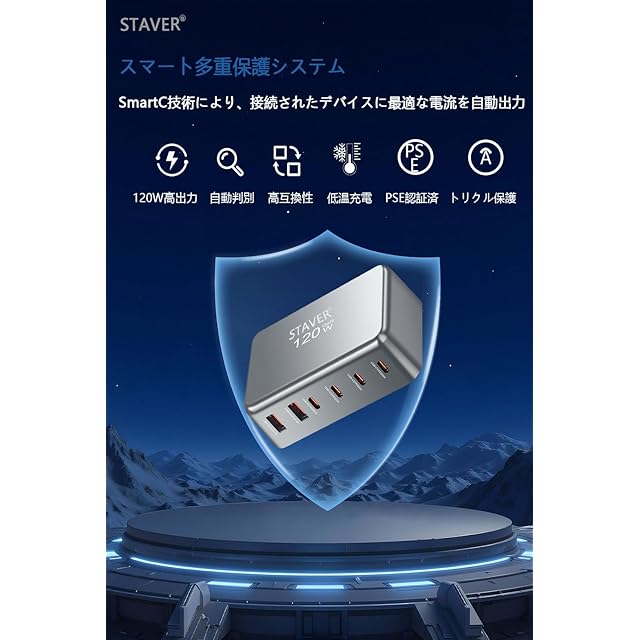 商品名:120W 充電器 【 GaNFastⅢ 6ポート同時充電125W! 】45W常時対応 【PSE技術基準適合】 PD3.0対応 6ポート4 USB-C&2 USB-A 1.5m電源ケーブル GaNFastⅢ(窒化ガリウム) 複数ノートPCに急速充電対応 MacBook Pro PD対応Windows PC/iPad/iPhone/Android/その他