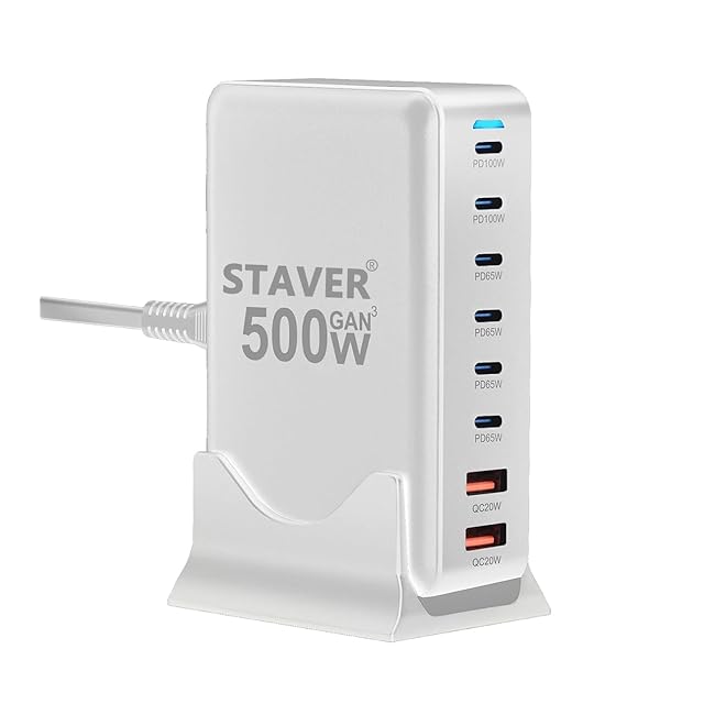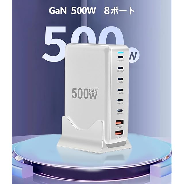 500W 充電器 【PSE技術基準適合】【2024新登場 GaNFastⅢ 8ポート 2*単口100W 】 PD3.0対応 8ポート同時急速充電 2*100W&4*65W&2*QC20W 6 USB-C&2 USB-A 縦式省スペース ダブル GaNFastⅢ(窒化ガリウム) 2*100W常時対応 複数ノートPCに急速充電対応 MacBook Pro PD対応 iPad/iPhone/Android/その他