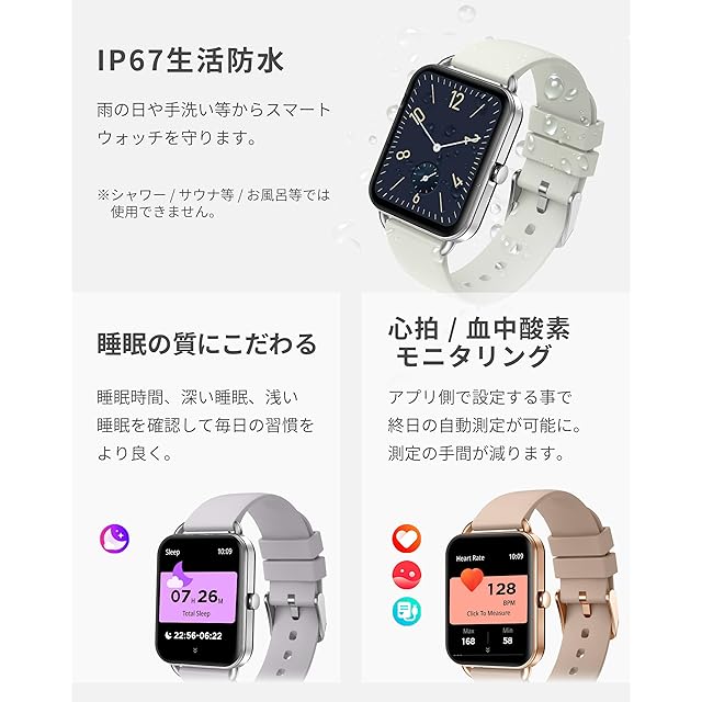 【主要機能】「メッセージ/着信通知(対応済みアプリ:LINE/着信/SMS/Facebook/X(Twitter)/Instagram/WhatsApp/WeChat/Skype/KaKaoTalk/QQ」「AMOLED常時表示ディスプレイ」「メッセージ/着信通知」「通話」「連絡先保存」「音声アシスタント」「ステップ数」「消費カロリー」「睡眠記録」「スポーツ測定」「天気予報」「音楽操作」「生理周期管理」「遠隔撮影」「ストップウォッチ」「タイマー」「アラーム」「計算機」「腕振り点灯」「スマートフォンを探す」「呼吸エクササイズ(リラックス)」「壁紙変更」「明るさ調整」「世界時計」「座りがち通知」他