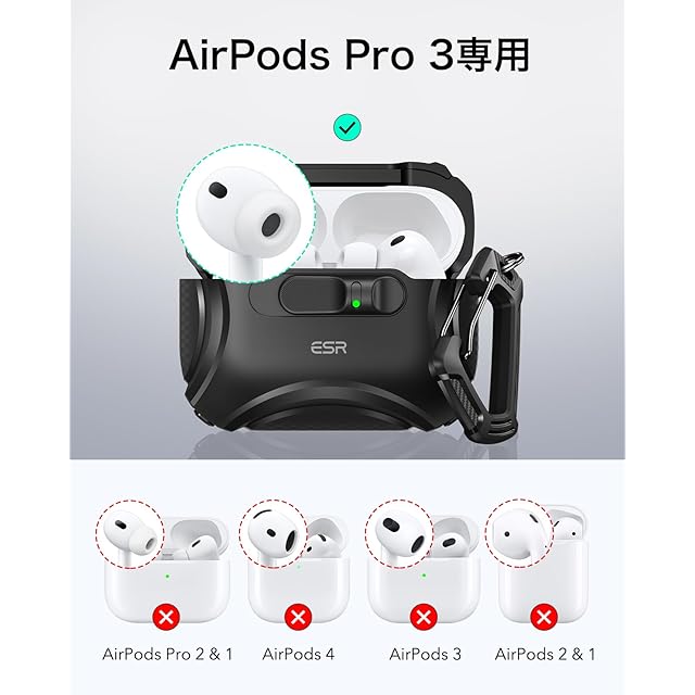 【互換性】:AirPods Pro 3(2025年モデル、USB-Cケーブル対応)専用。AirPods Pro 2/1(2023/2022/2019モデル)には対応していません。イヤホン本体および充電ケースは含まれません。
