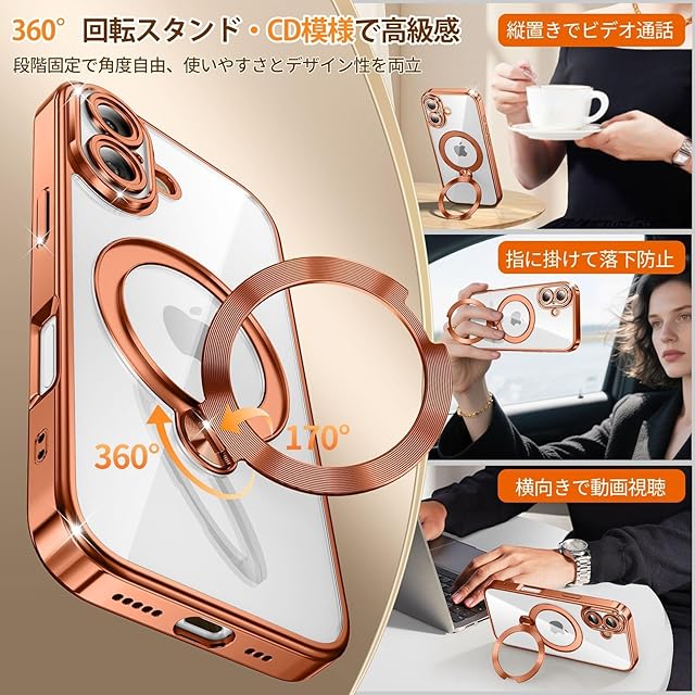 商品名:iPhone 17 用 ケース MagSafe対応 光沢CD紋様リング 360°定点回転スタンド 縦横両対応 マグセーフ対応 メッキバンパー キラキラ 背面クリア 精密開口レンズ保護 いphone 17 ケース Gunwon スマホケース 米軍規格 耐衝撃 黄変防止 マグネット付け 超強磁力 ワイヤレス充電 ストラップホール付き アイフォン17用 携帯ケース「オレンジ」