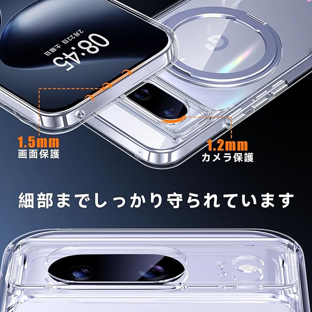 MagSafe対応でワイヤレス充電もスムーズに行え、360°回転リングスタンドで縦横両対応。映画鑑賞やオンライン学習に最適です。MIL規格準拠の高耐衝撃性で、Google Pixel 8をしっかり守ります。高硬度ポリカーボネートとTPU素材を採用し、衝撃や傷から守り、便利なストラップホールで持ち運びも楽々。クリアデザインで黄ばみ防止にも配慮。