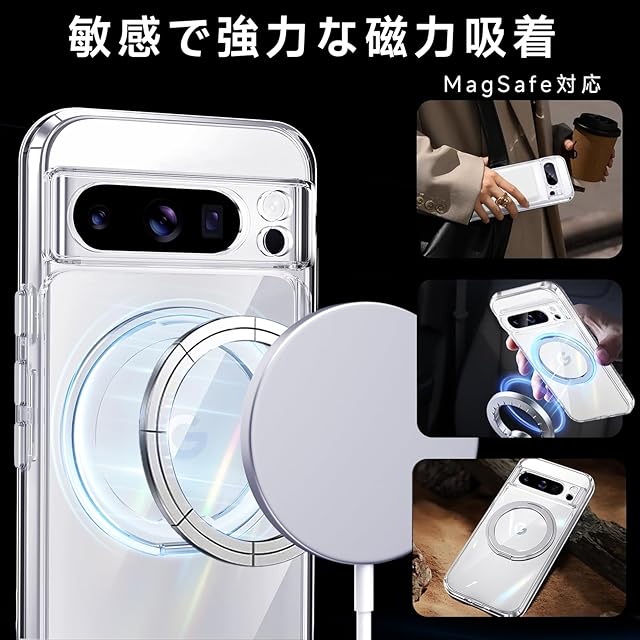 商品名:【米軍MIL規格・Magsafe対応】Google Pixel 8 Pro 用 ケース MagSafe対応 リング360°回転スタンド機能 縦横両対応 透明 黄ばみ防止 ワイヤレス充電 レンズ保護 耐衝撃 携帯カバー 6.7 インチ マグネット搭載 車載ホルダー マグセーフ対応 おしゃれ(クリア)