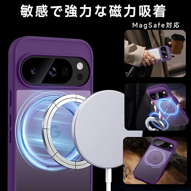 【米軍MIL規格・Magsafe対応】Google Pixel 9 / 9 Pro 用 ケース MagSafe対応 リング 360°回転スタンド機能 縦横両対応 半透明 黄ばみ防止 ワイヤレス充電 レンズ保護 耐衝撃 携帯カバー グーグルピクセル9/9プロ カバー 6.3 インチ マグネット搭載 車載ホルダー マグセーフ対応 おしゃれ (パープル)