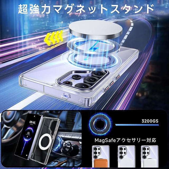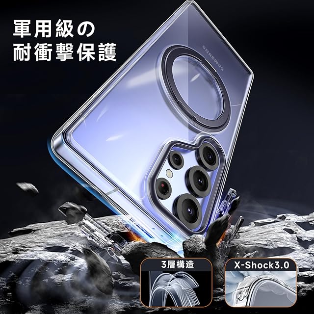 商品名:【米軍MIL規格・Magsafe対応】Galaxy S25 Ultra 用 ケース MagSafe対応 リング 360°回転スタンド機能 縦横両対応 透明 黄ばみ防止 ワイヤレス充電 レンズ保護 耐衝撃 携帯カバー ギャラクシーS25 ウルトラ カバー マグネット搭載 車載ホルダー マグセーフ対応 おしゃれ (クリアブラック)