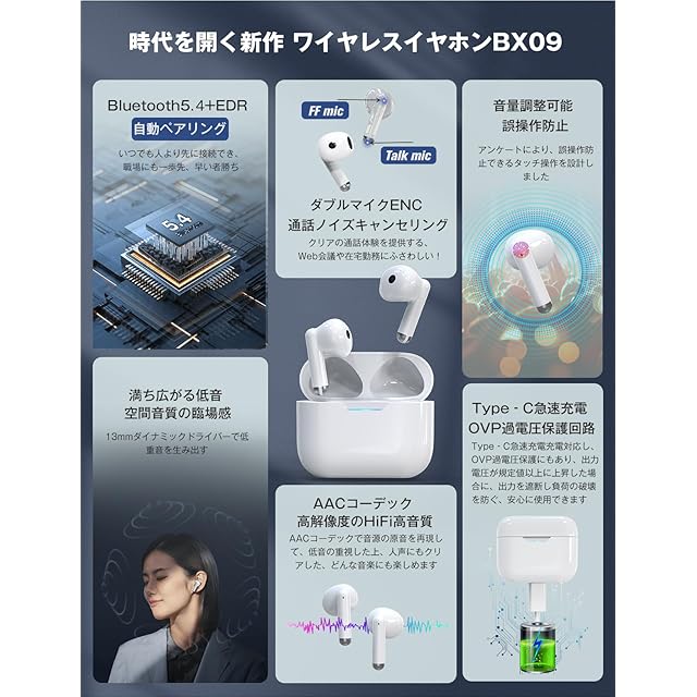 商品名:ワイヤレスイヤホン bluetooth 5.4 【ダブル マイクENC CVC8.0通話ノイズキャンセリ】自動ペアリング EDR 空間オーディオ音質 hi-fi音質 AACコーデック ブルートゥース ハンズフリー通話 無線 片耳 インナーイヤー タイプc OVP過充電保護 長時間 タッチセンサー 左右分離 フィット 通勤通学/散歩/WEB/テレワーク/ZOOM/電話