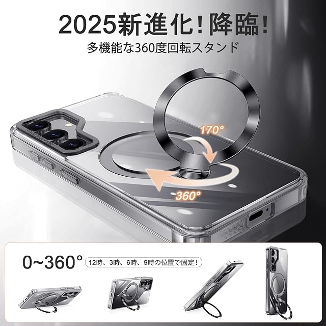 【360°回転リングスタンド・縦横対応で角度自由】強力マグネット内蔵の360°回転リングスタンドを搭載。新幹線での動画視聴、カフェでのビデオ会議、デスクでの資料確認など、あらゆるビジネスシーンでハンズフリーを実現。強磁力設計によりスタンドがしっかり固定され、安定性抜群。また、スマホリングとしても使用でき、片手で簡単に操作できます。さらに、全隠し式スタンドデザインで、使用しない時は水平に収納でき、スペースを節約して携帯に便利です。このギャラクシー S24 / S25 クリアケースは、スマートフォンの使い方をさらに広げます。