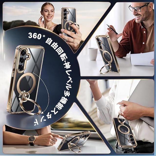 【360°回転リングスタンド・縦横対応で角度自由】強力マグネット内蔵の360°回転リングスタンドを搭載。新幹線での動画視聴、カフェでのビデオ会議、デスクでの資料確認など、あらゆるビジネスシーンでハンズフリーを実現。強磁力設計によりスタンドがしっかり固定され、安定性抜群。また、スマホリングとしても使用でき、片手で簡単に操作できます。さらに、全隠し式スタンドデザインで、使用しない時は水平に収納でき、スペースを節約して携帯に便利です。このギャラクシー S24 / S25 クリアケースは、スマートフォンの使い方をさらに広げます。