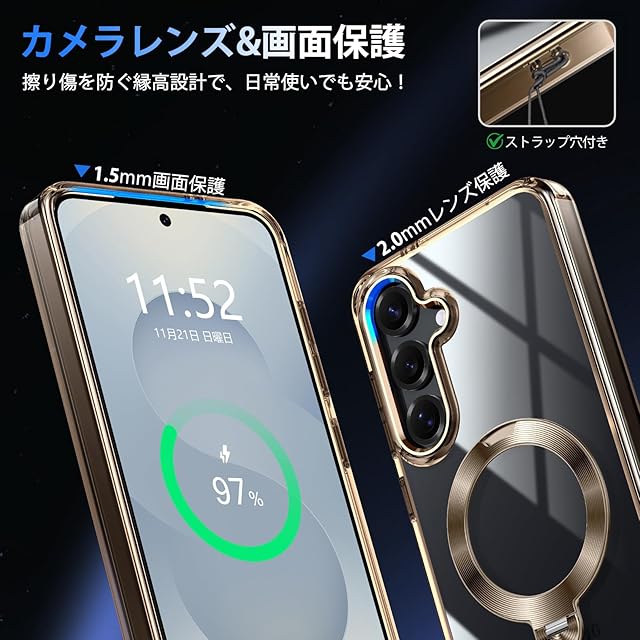 Galaxy S24 / Galaxy S25 の魅力を最大限に引き出す、多機能で安心のスマホケースが登場!360°回転のリングスタンドは縦横両対応で、動画視聴やビデオ通話など様々なシーンで大活躍。さらに、MagSafe対応の強力な磁石を搭載しており、このGalaxy S24 / S25 カバーを装着したままでも安定したワイヤレス充電が可能です。米軍MIL規格準拠の耐衝撃構造と、四隅のエアクッション、カメラや画面を守る高設計で、落下や衝撃からスマホをしっかり保護。透明度の高いドイツ製素材を採用し、黄ばみにくく、美しい外観を長くキープ。機能性・耐久性・デザインを兼ね備えたギャラクシーs24 / s25 携帯カバーを、この機会にぜひお試しくださいませ。