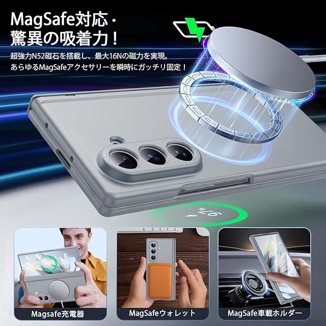 【MagSafe対応・高速ワイヤレス充電を妨げない設計】MagSafe対応ワイヤレス充電器と完全互換。業界最強のN52磁石を搭載し、16Nの強力な磁力を実現。このギャラクシー z フォールド7 ケースを装着した状態でも、高速かつ効率的なワイヤレス充電を実現できます。強力な磁力が充電器を正確に吸着・固定するため、充電中のズレや接続不良を防止。ワイヤレス充電器、モバイルバッテリー、リング、ウォレット、さまざまなアクセサリーと組み合わせ、MagSafe対応のあらゆる場所にスマホを磁力で固定可能で、生活がより便利に。ご注意:この製品はすべての Magsafe デバイスと互換性がありますが、Qi ワイヤレス充電には適していないため、ご購入前にご検討いただければ幸いです。