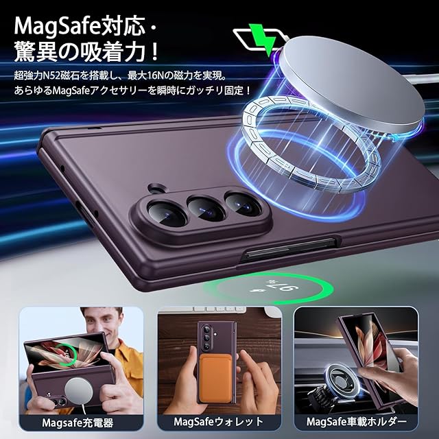 【MagSafe対応・高速ワイヤレス充電を妨げない設計】MagSafe対応ワイヤレス充電器と完全互換。業界最強のN52磁石を搭載し、16Nの強力な磁力を実現。このギャラクシー z フォールド7 ケースを装着した状態でも、高速かつ効率的なワイヤレス充電を実現できます。強力な磁力が充電器を正確に吸着・固定するため、充電中のズレや接続不良を防止。ワイヤレス充電器、モバイルバッテリー、リング、ウォレット、さまざまなアクセサリーと組み合わせ、MagSafe対応のあらゆる場所にスマホを磁力で固定可能で、生活がより便利に。ご注意:この製品はすべての Magsafe デバイスと互換性がありますが、Qi ワイヤレス充電には適していないため、ご購入前にご検討いただければ幸いです。