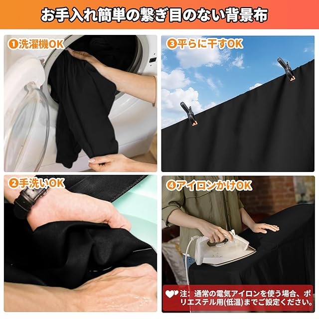 しっかりした生地、垂れ感が良い:この150×200cmの背景布 黒はポリエステルの材質で、綿製よりシワが目立たないし、低温アイロンでシワを簡単に取れます。