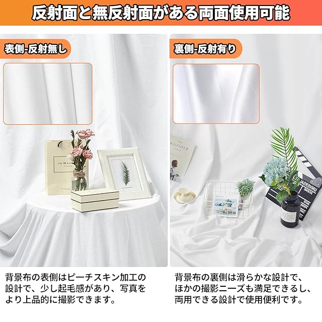 両面使えるパイプ差し込み設計の背景布 白:この撮影用 背景シートの正面は無反射で、余計な光の反射を防ぎ、光沢感を抑えます。撮影対象を自然に引き立てできます。白布の裏面は反射面、上品で高級感があり、様々な撮影ニーズに満足ができます。★撮影背景 白 布の先端には袋縫い加工、背景スタンドのポールを差し込むだけで設置できます。クロスバーは直径60mmまでに対応します。