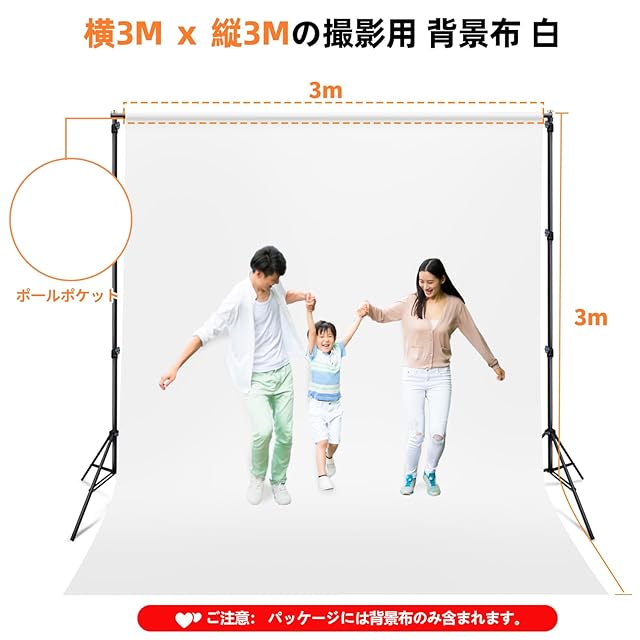パッケージ内容:3m x 3mの背景布 白布×1枚 ★ご注意:背景布は折り畳んで出荷しており、もし届ける際にしわがある場合、使用前に先ず低温アイロンをかけてください。