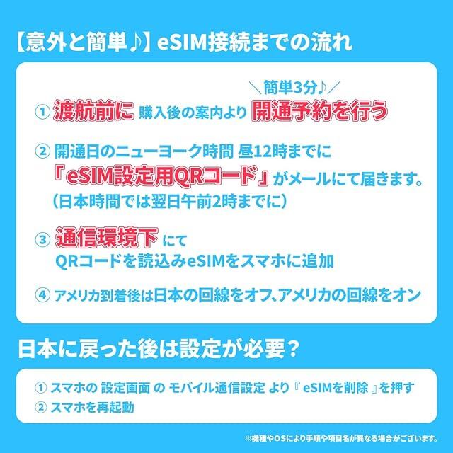こちらの商品は物理SIMカードを使用しない esim 商品になります。 ※※詳しい商品説明や対応端末はページ下の写真付きの商品説明をご覧ください。※※ tabitsu sim ホームページに分かりやすくまとめたQ&Aもございます→www.tabitsu.com ・【正規代理店】アメリカ3大キャリアの1つ、T-MobileのSIMカードです。とにかくコストパフォーマンスを求める方、旅行中に使用制限を気にしたくない方、留学などの中期滞在の方などにオススメ致します。 ・【T-Mobileの純正商品】【アメリカの電話番号付き】格安MVNOより安定し、通信速度も速いです。アメリカ、ハワイへの電話し放題。5G・4G/LTE高速データ、SMS、テザリングも無制限!!(グアム、サイパン除く)サービスエリアの確認はこちら⇒ https://maps.t-mobile.com/(カナダ、メキシコは地図の色関係なくご利用いただけません。) ・【日本語説明書付き】商品到着後、取扱説明書のQRコードより開通日を予約。早めの手続きをお願い致します。 ・【安心の日本語カスタマーサポート】不具合やご不明点がございましたら、tabitsu公式LINEより個別サポート致します。24時間対応。