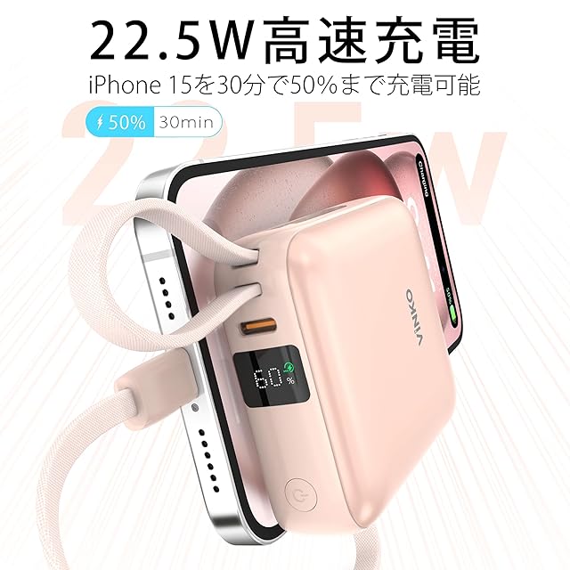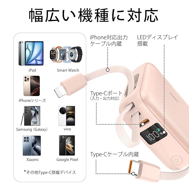商品名:VINKO モバイルバッテリー 軽量 小型 10000mAh 3c認証 ccc 大容量 -スマホバッテリー 急速充電 Lightning type-c ケーブル内蔵 -携帯充電器 PD 22.5W 3台同時充電 スマホ 持ち運び iPhone 17/16/15 Android iPad 各種機器対応 コンパクト&軽量 機内持ち込み 旅行/出張/アウトドア/停電対策/防災 PSE認証済 (ピンク)