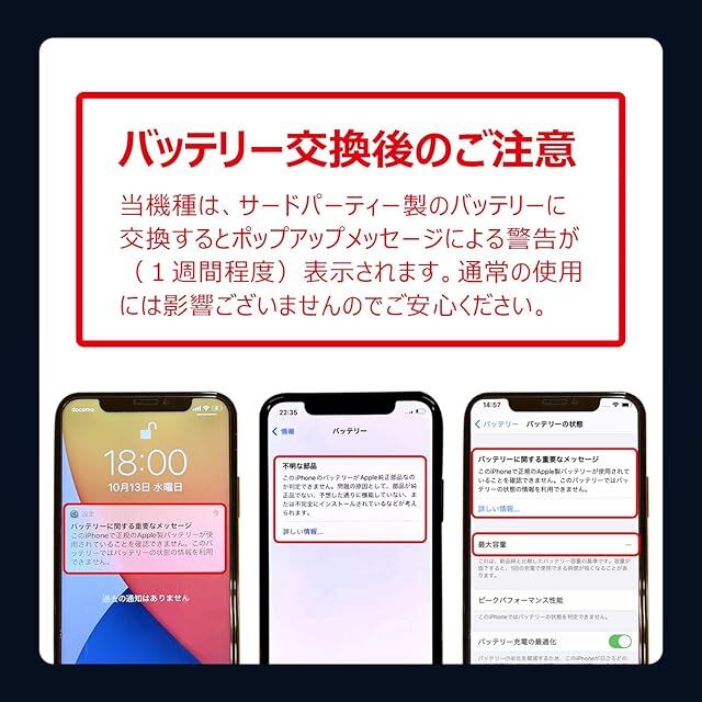 【2年間(24か月)の製品付き】本バッテリーの初期不良や期間内の正常なご使用により膨張(兆候含む)等の不具合が生じた場合は、速やかにiPhoneの使用を中止し、販売元までお問合せください。迅速に対応いたします。 (※バッテリー交換直後に電池の減りが早い等の問題が生じた場合は、一度、バッテリーのキャリブレーション(0%まで使い切り、そこから一気に100%まで充電する)を数回行ってみてください。症状が改善する場合がございます。)