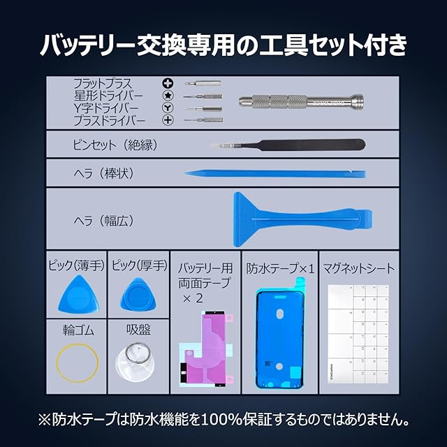・iPhone 対応の互換バッテリー&修理工具セットです。使いやすい工具付き!この交換キット1つあればご自分でiPhoneのバッテリー交換が可能です。※取付手順書は付属しません。交換方法は「YouTube」や「iFixit」などのサイトで事前にご確認ください。 ・iPhoneのバッテリーは、充電の繰り返しにより徐々に劣化してしまいます。電池がすぐに無くなる、突然電源が切れる、充電の持ちが悪くなってきたと感じたときがバッテリー交換の目安です。 ・純正品と同様のTI社製ICチップを使用し、iOSのアップデートにも対応しているので、アップデート後も安心してご利用いただけます。 ・ご注文日より2年間(24ヶ月間)の長期製品つきです。 ・バッテリー交換は「自己責任」であることをご了承のうえ、ご購入ください。