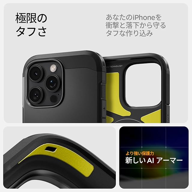 【AIを利用したSpigen最強の耐衝撃ケース】装脱着が簡単になる柔らかいTPU(熱可塑性ポリウレタン)に丈夫なPC(ポリカーボネート)をハイブリッドさせた2重構造でデバイスを守ります。AI(人工知能)から衝撃を受けやすいと予測してもらった部位に黄色い「XRDパッド」を付着し、落下時の衝撃を吸収させることでさらに保護力を極めました。
