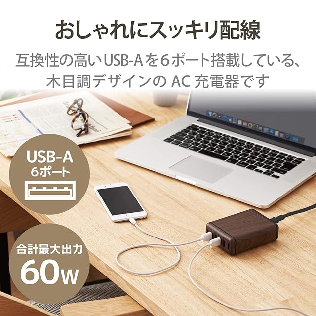 商品名:エレコム USB コンセント 充電器 合計60W Aポート×6 【 iPhone15など/Android/タブレット 対応 】 木目 ウォールナット EC-ACD01W
